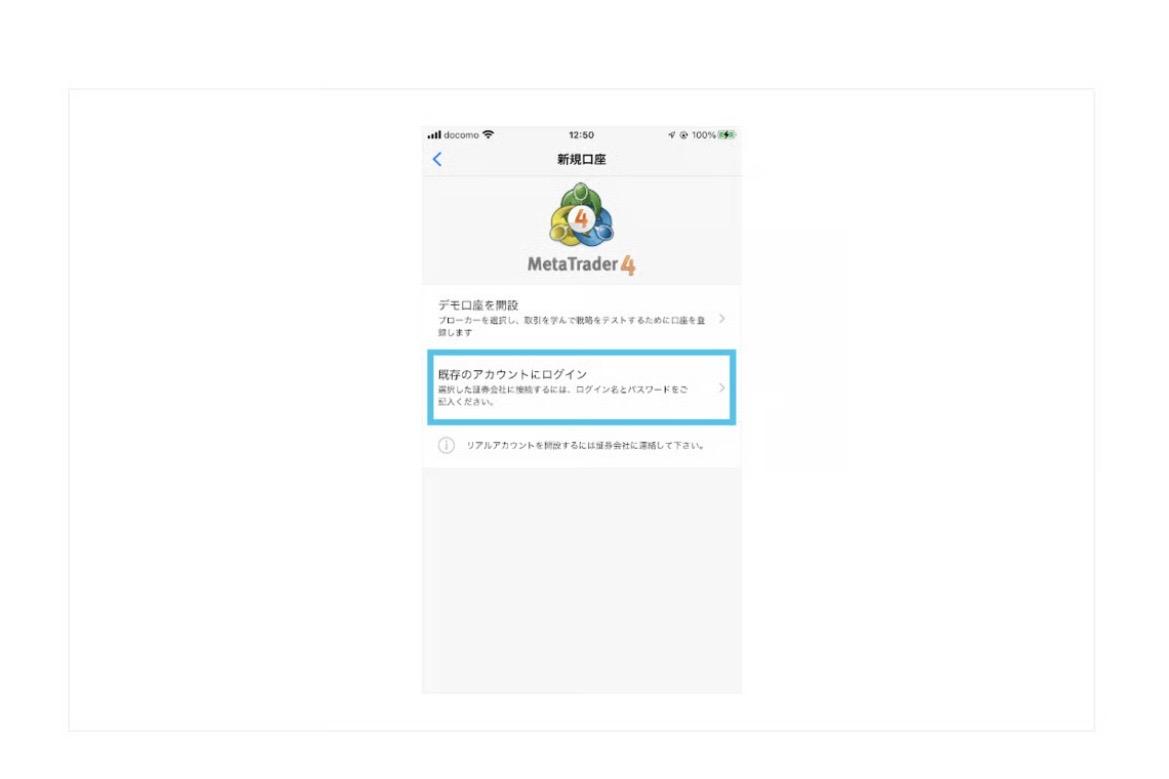 「ログイン」には本登録完了メールに記載の「MT4のID(口座番号)」を、「パスワード」には口座開設時にご自身で設定した「パスワード」を入力して「サインイン」をタップします。