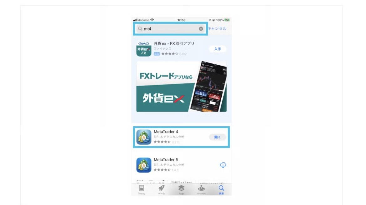 スマホの「App Store」や「Google Play」で「mt4」と検索し、MT4のアプリをインストールします。