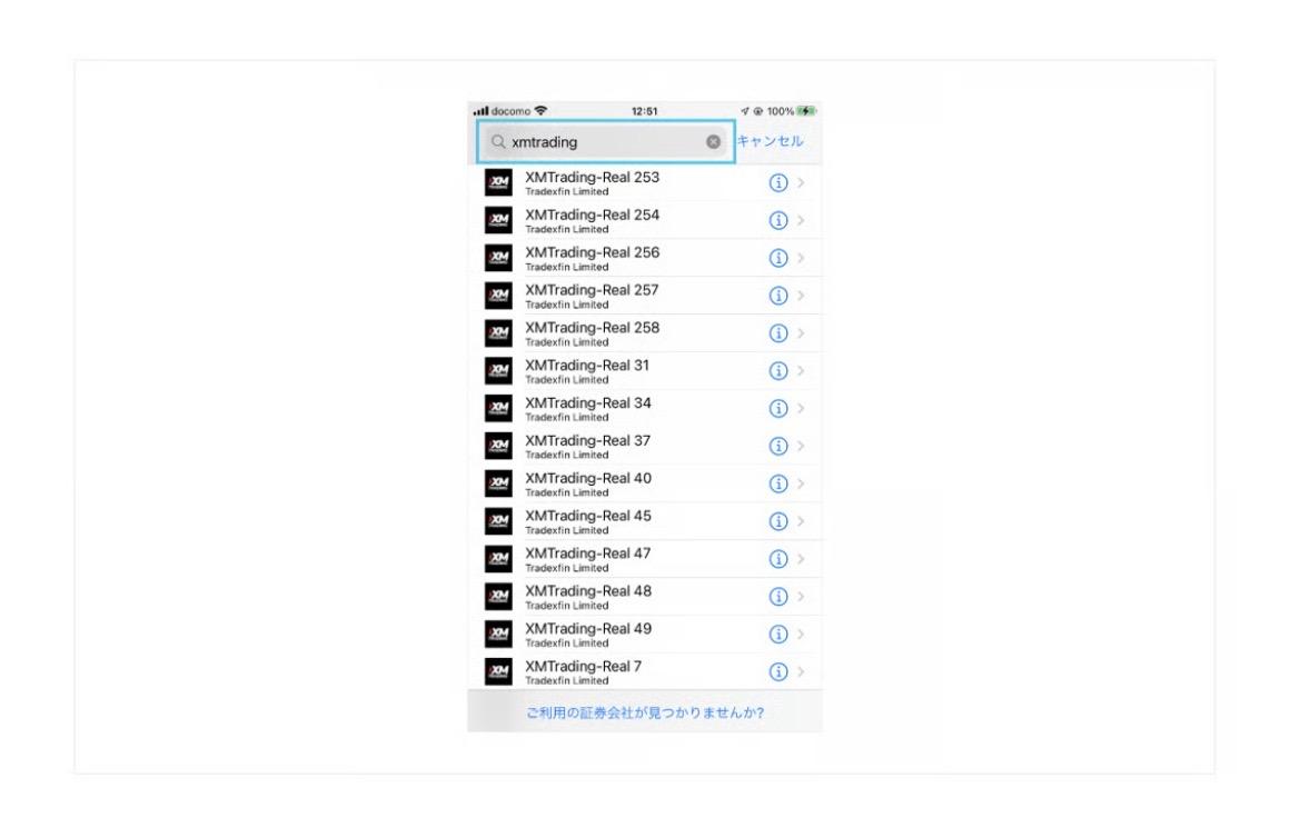 サーバーの検索窓に「xmtrading」と入力して検索し、本登録完了メールに記載の「サーバー名」をタップします。