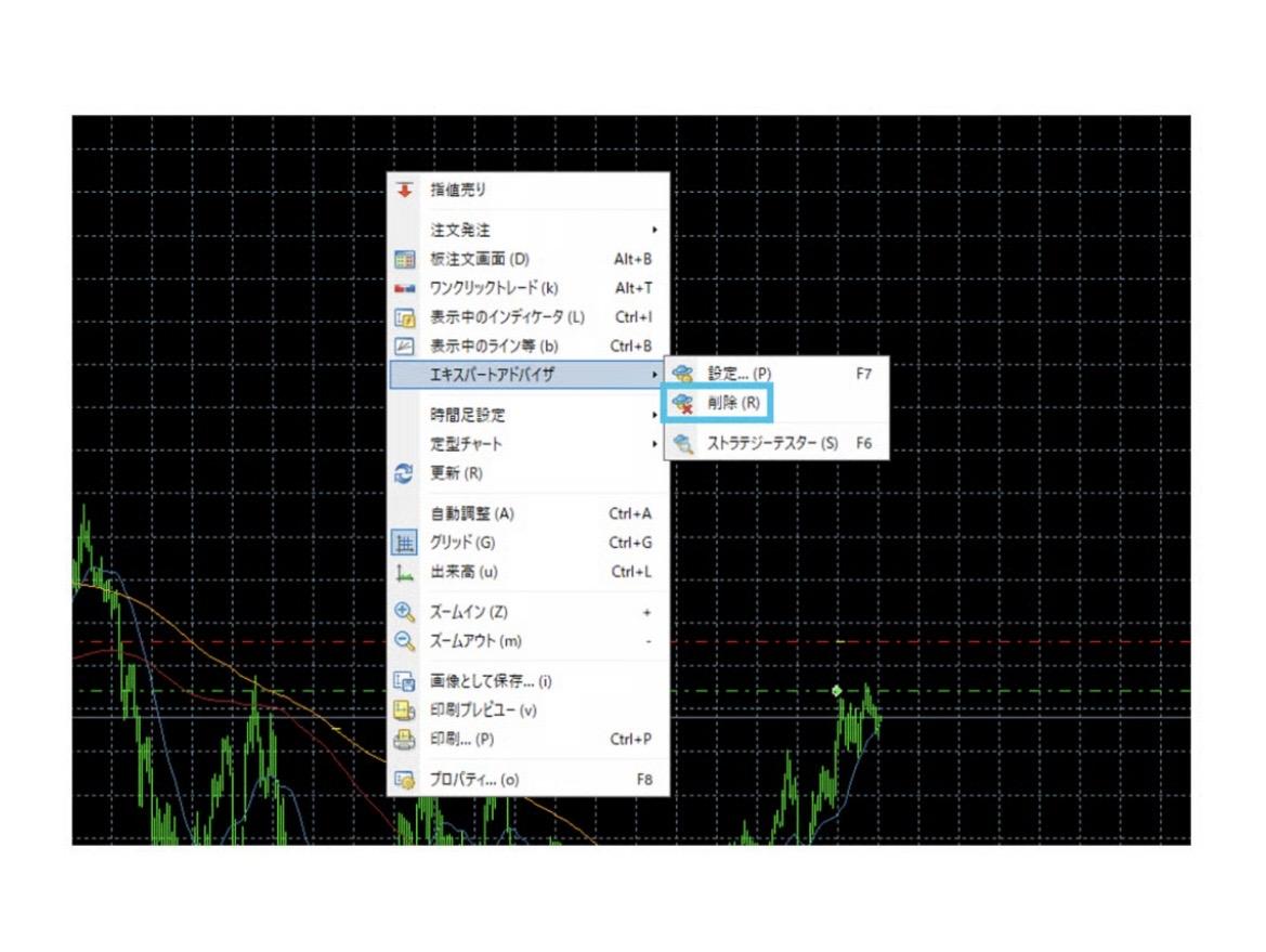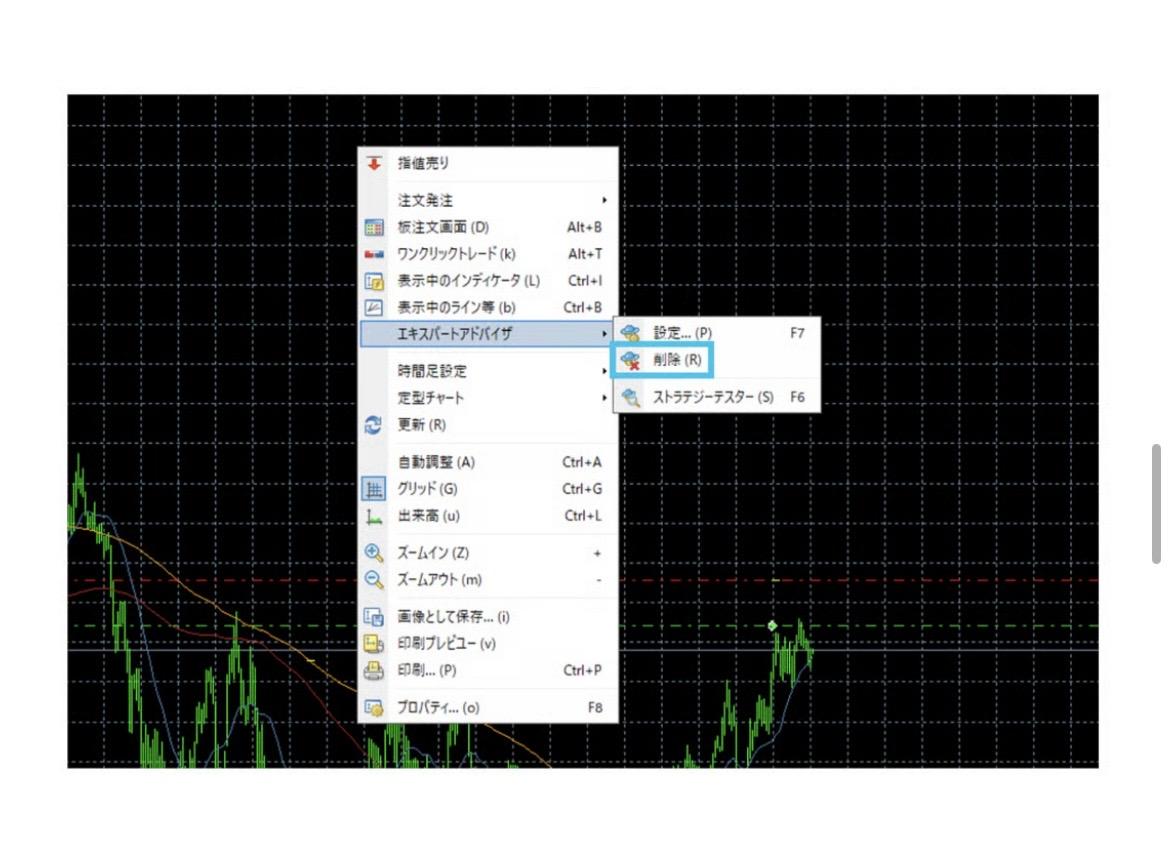 入金手続きをすればエラーメッセージは消えますが、それまでは次の手順で自動システムをチャート上から一旦削除しましょう。