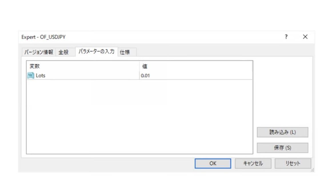 「パラメーターの入力」タブにてLots(ロット)を設定し、「OK」をクリックします。