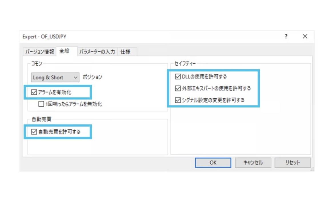 自動システムの設定画面が表示されるので、「全般」タブの5箇所にチェックを入れます。